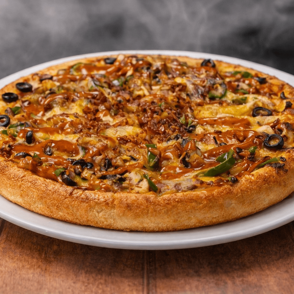 Pizza topped with chicken, pepperoni, bacon, mozzarella cheese, jalapeños, mushrooms, bell peppers, red onions, olives, tomatoes and marinara sauce.
