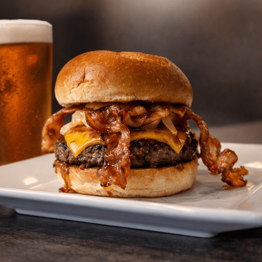 Double smash patty burger, topped with bacon, double cheddar cheese, beer-battered onion strings and sriracha ranch
