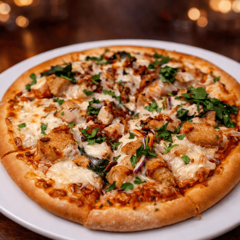 Pizza topped with grilled chicken, beer-battered shrimp, mozzarella cheese, bacon bites, fresh spinach, red onions, cilantro and marinara sauce.