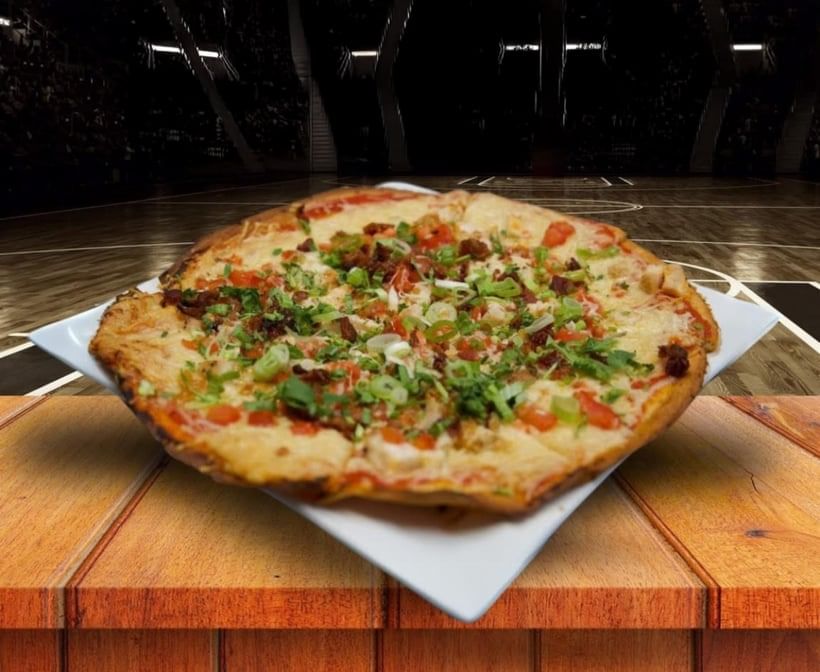 JAMS style pizza topped with bacon, grilled chicken, tri-tip, pepperoni, mozzarella cheese, jalapeños, red onions, olives and chipotle sauce served in a dome, infused with hickory smoke prior to serving.