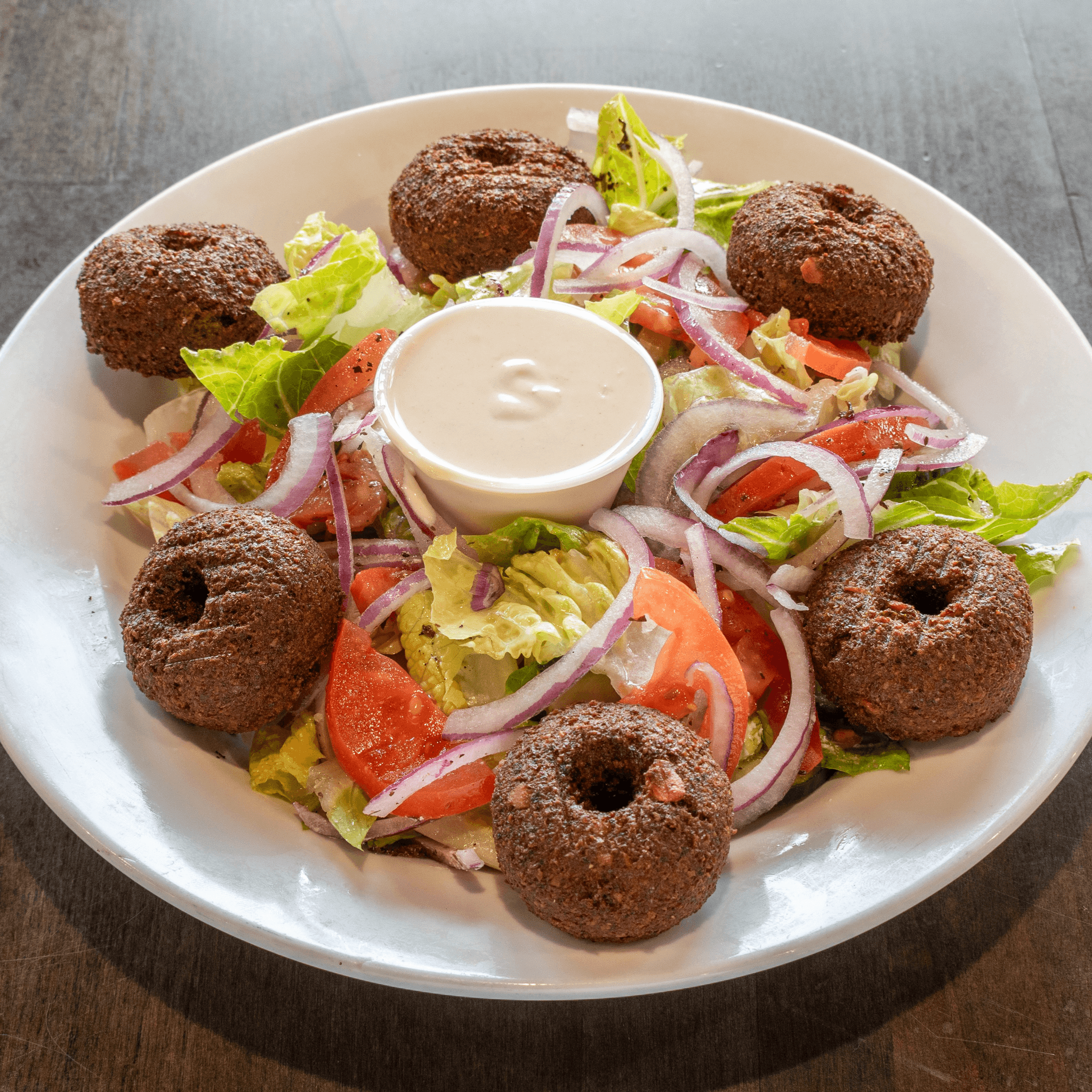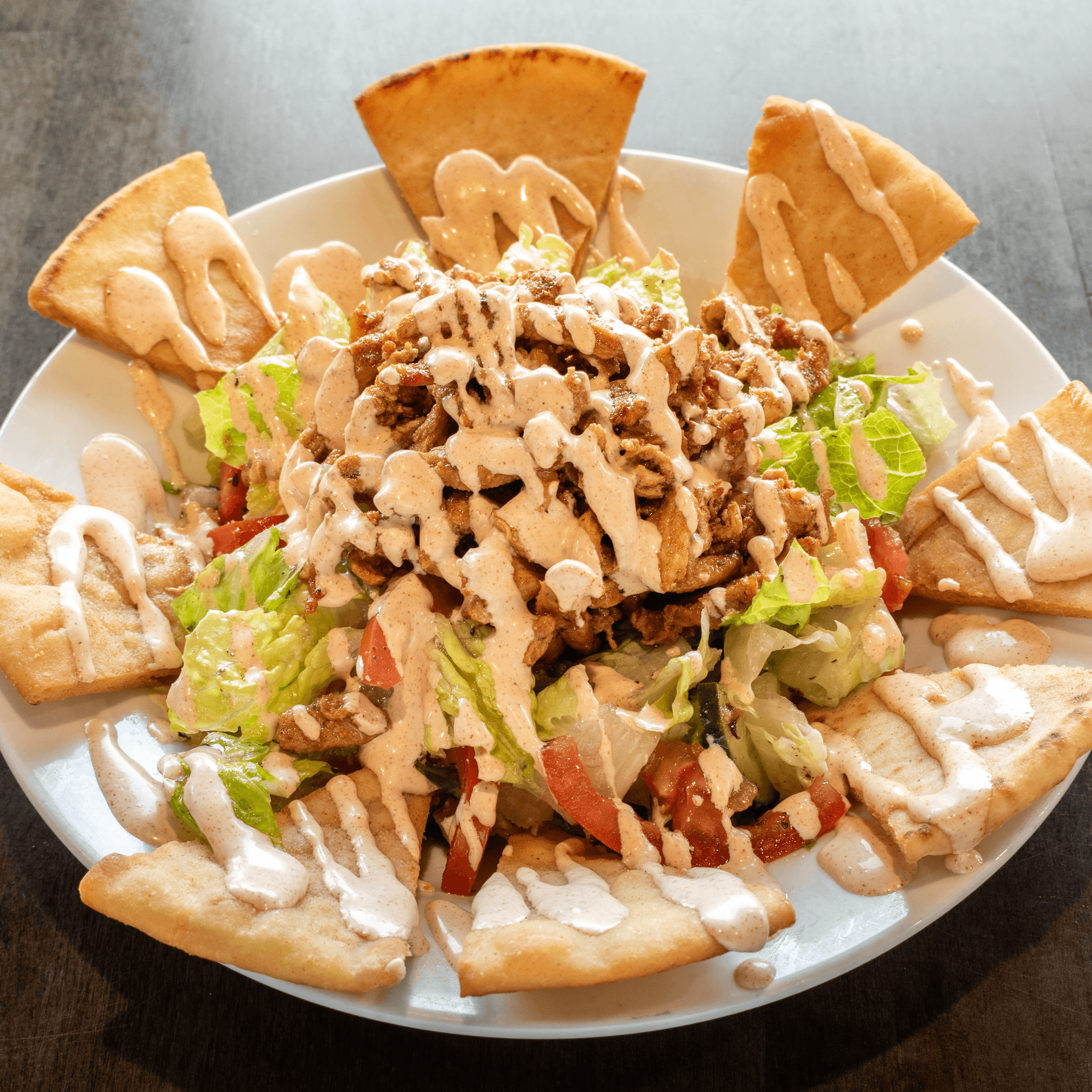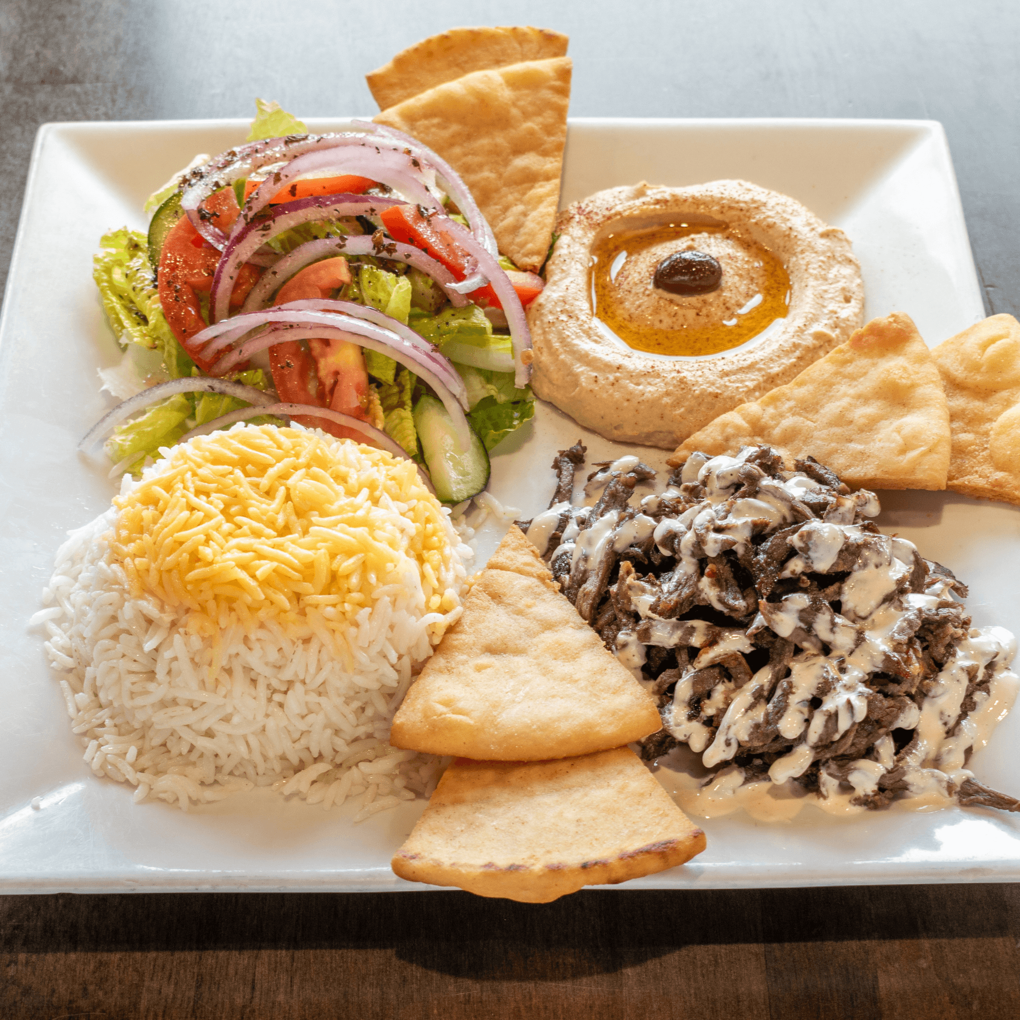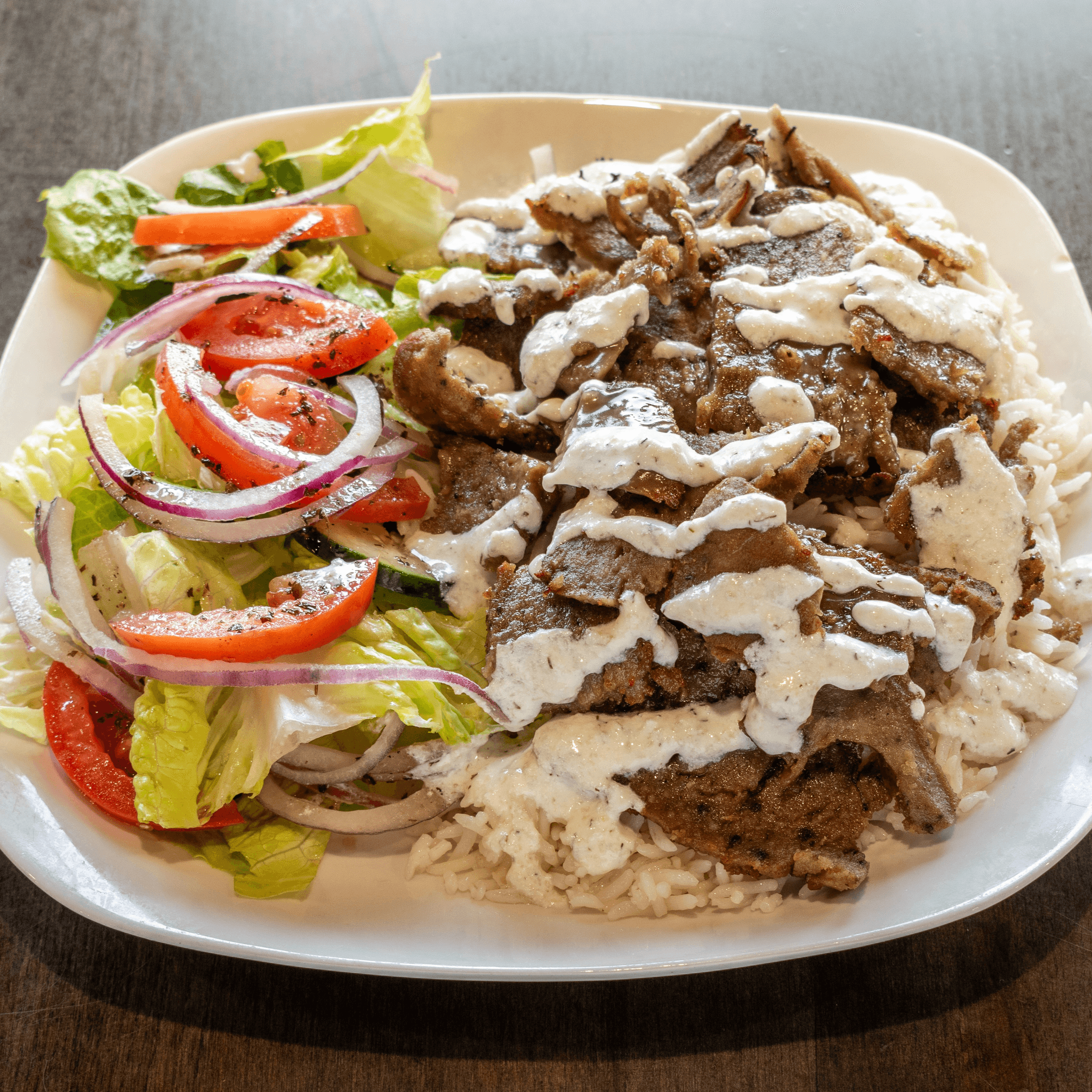 Gyro meat served over rice or fries topped with tzatziki sauce and a house salad