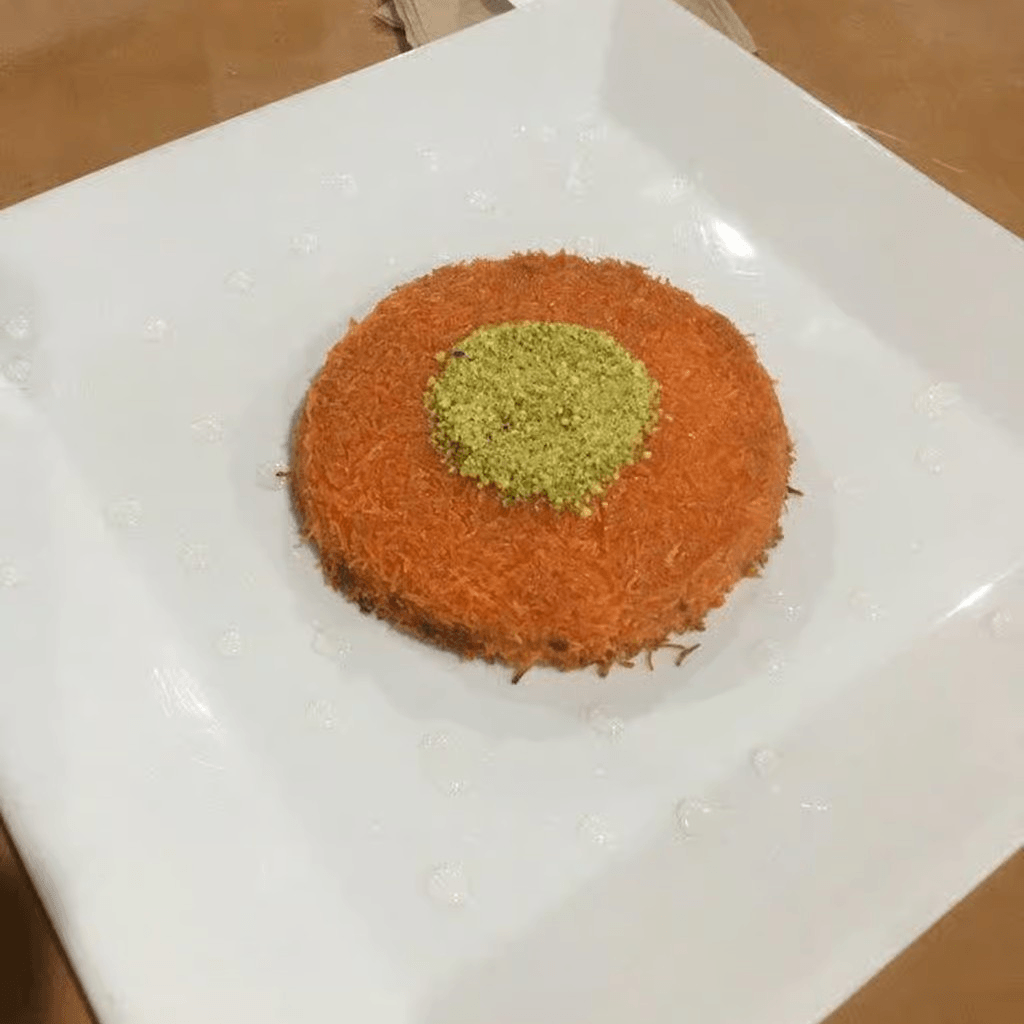 Dessert made with shredded pastry dough, filled with cream and cheese and smothered with a homemade sweet orange blossom syrup. Baked, as you order, to golden perfection