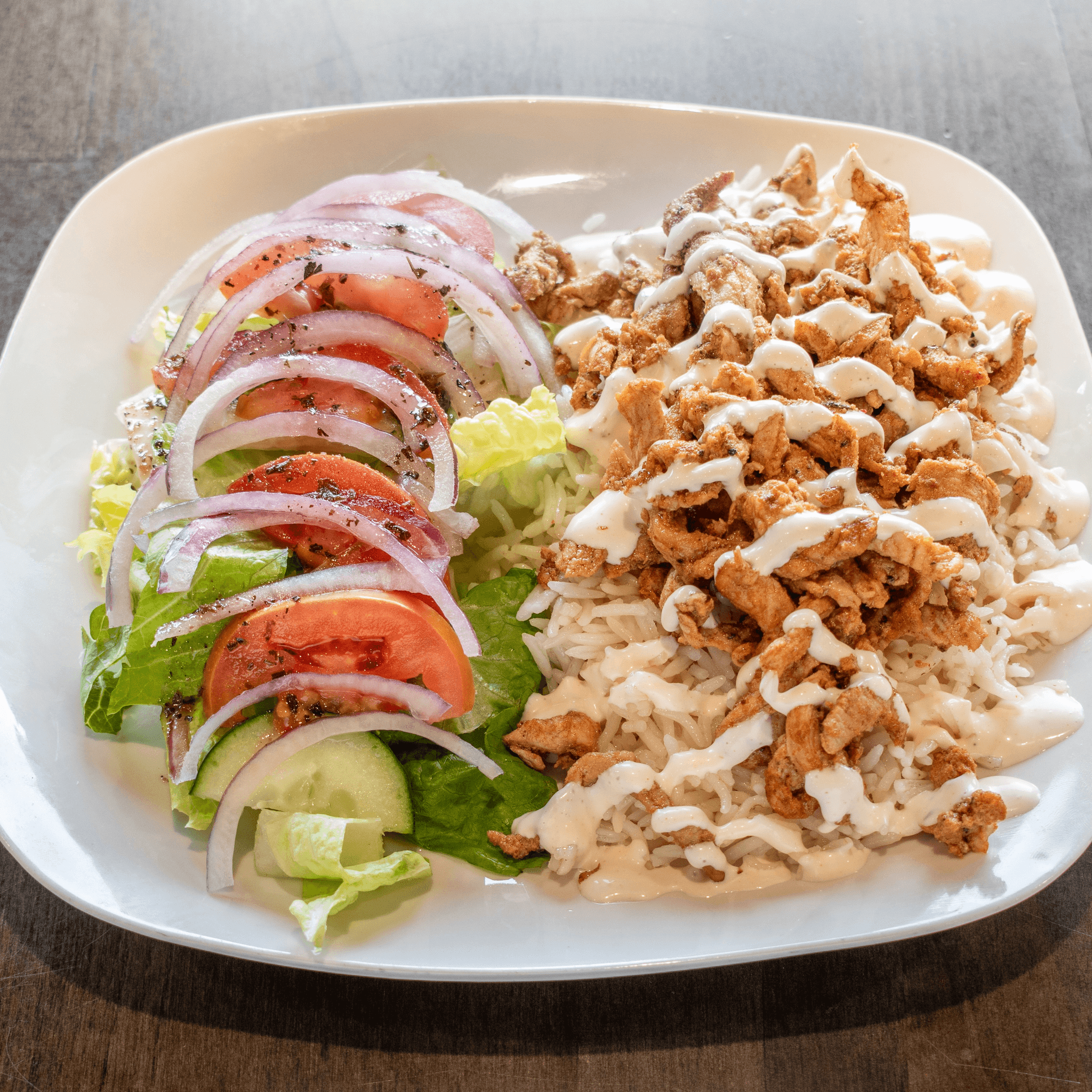 Marinated, seasoned chicken served over rice or fries topped with kebab sauce and house salad