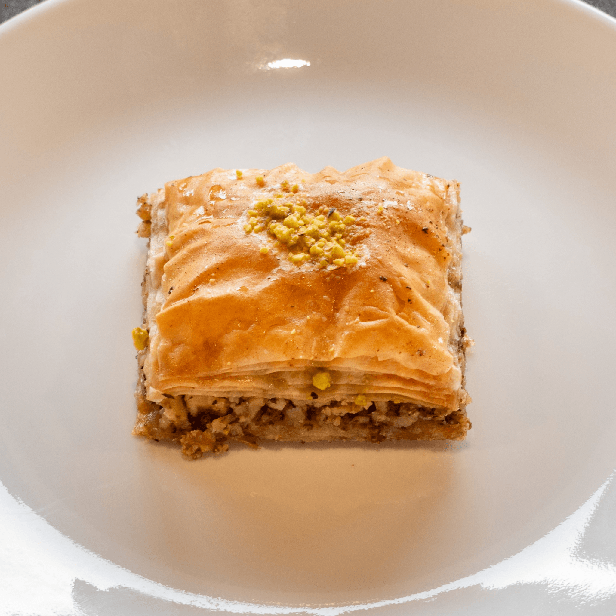 Dessert made of thin pastry dough layers filled with chopped walnuts, sweetened and held together by a homemade honey syrup, and topped with ground pistachios