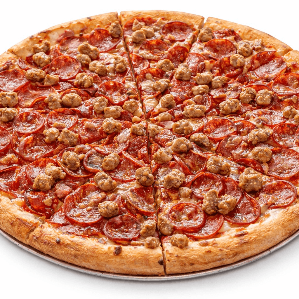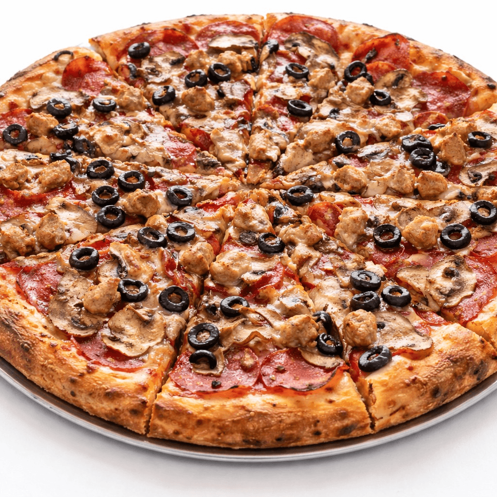 Salami, pepperoni, olives, mushrooms, sausage, tomatoes, bell peppers, onions