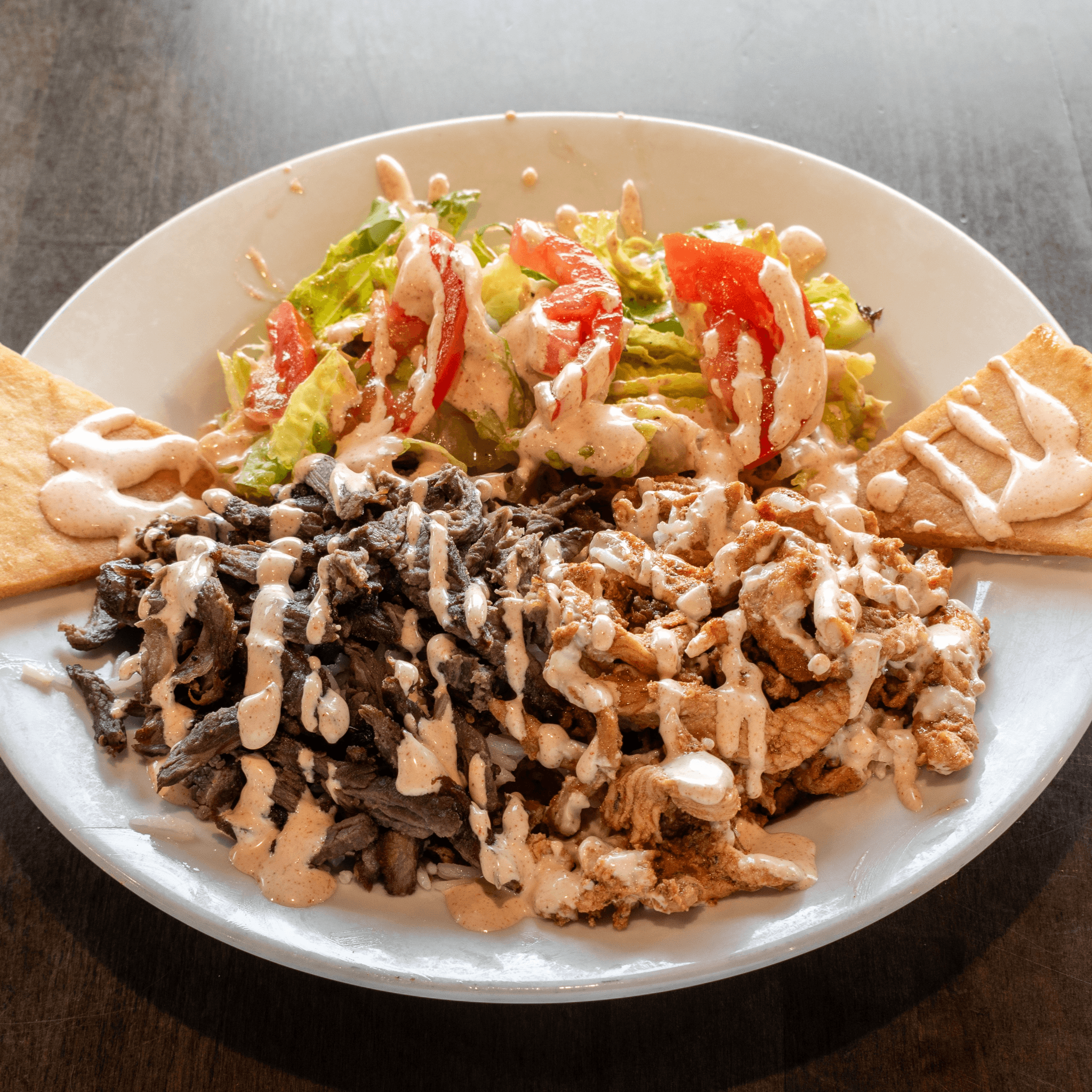 Rice or fries, your choice of 2 meats, salad, pita bread, topped with spicy kebab sauce